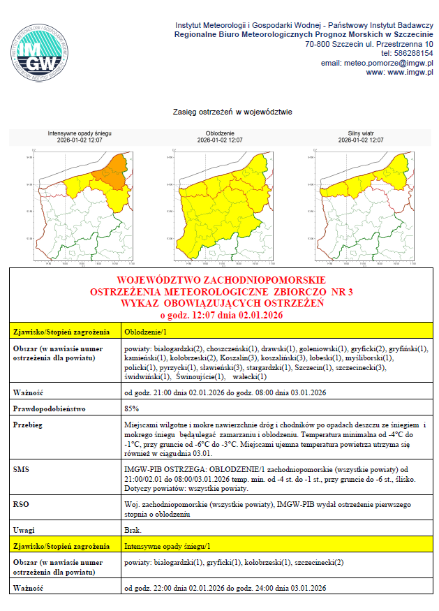 Instytut Meteorologii i Gospodarki Wodnej wydał ostrzeżenie dla naszego regionu dotyczące oblodzenia. W związku ze spadkiem temperatury poniżej 0°C, mokra nawierzchnia dróg i chodników może zamienić się