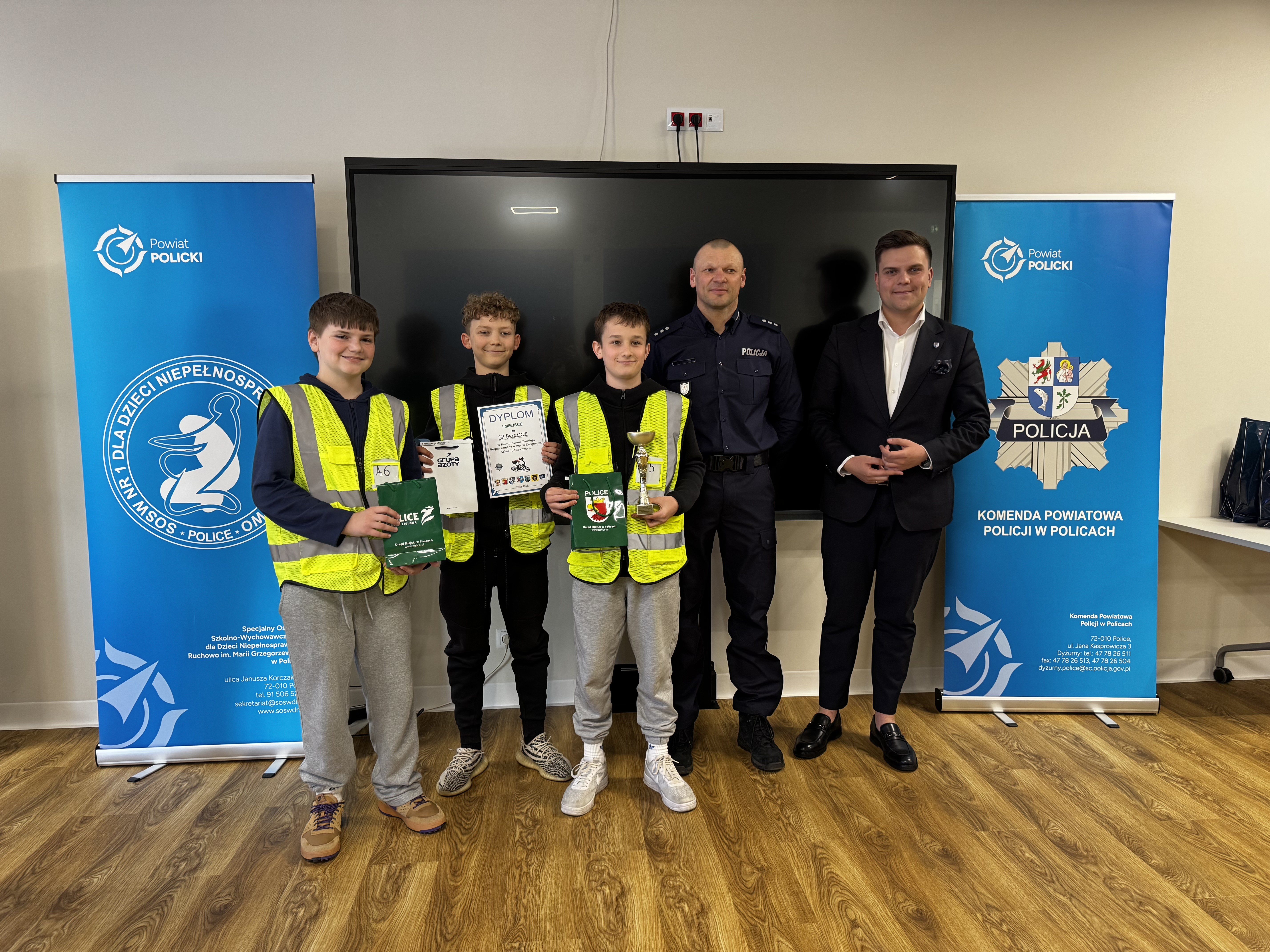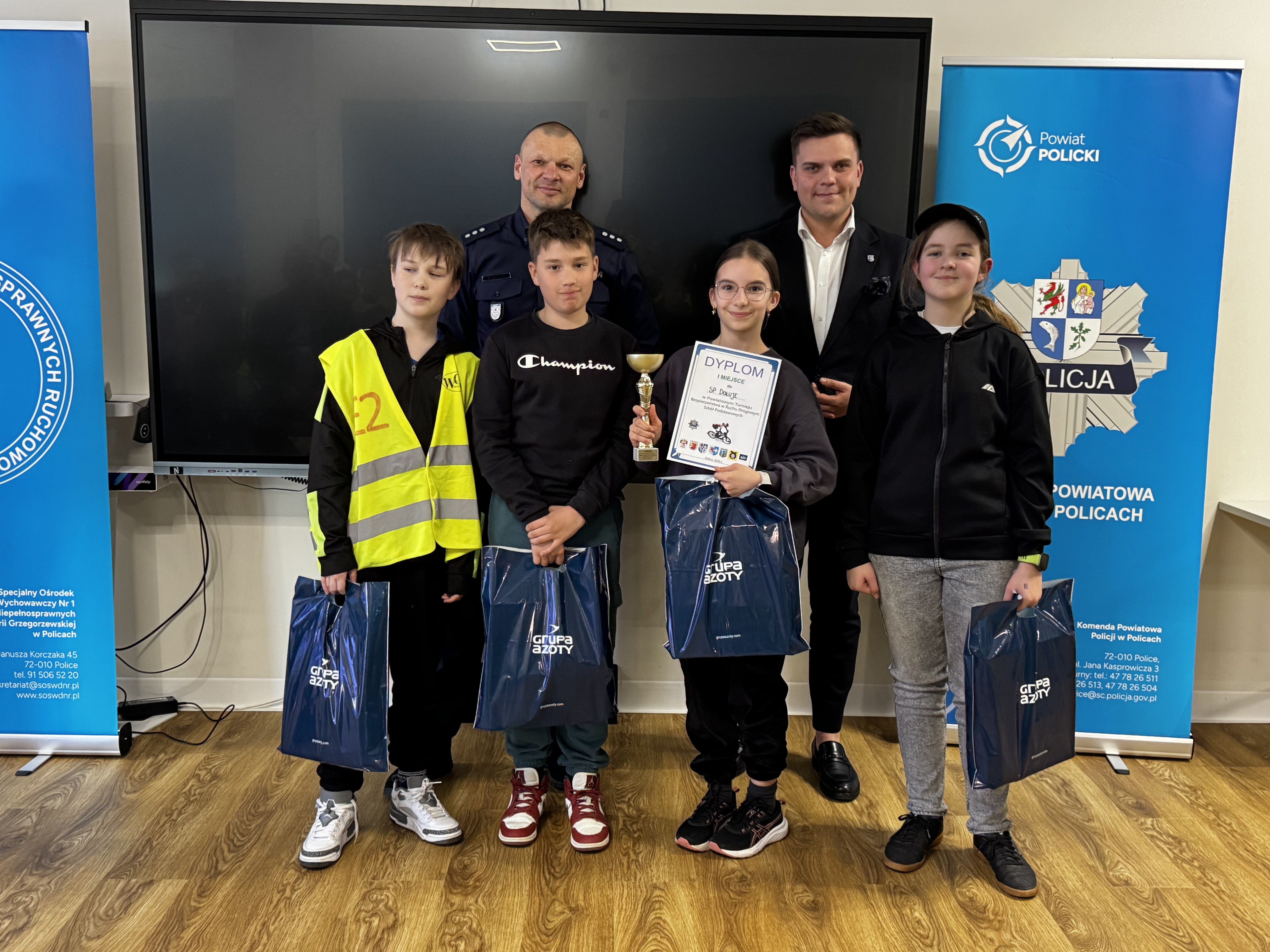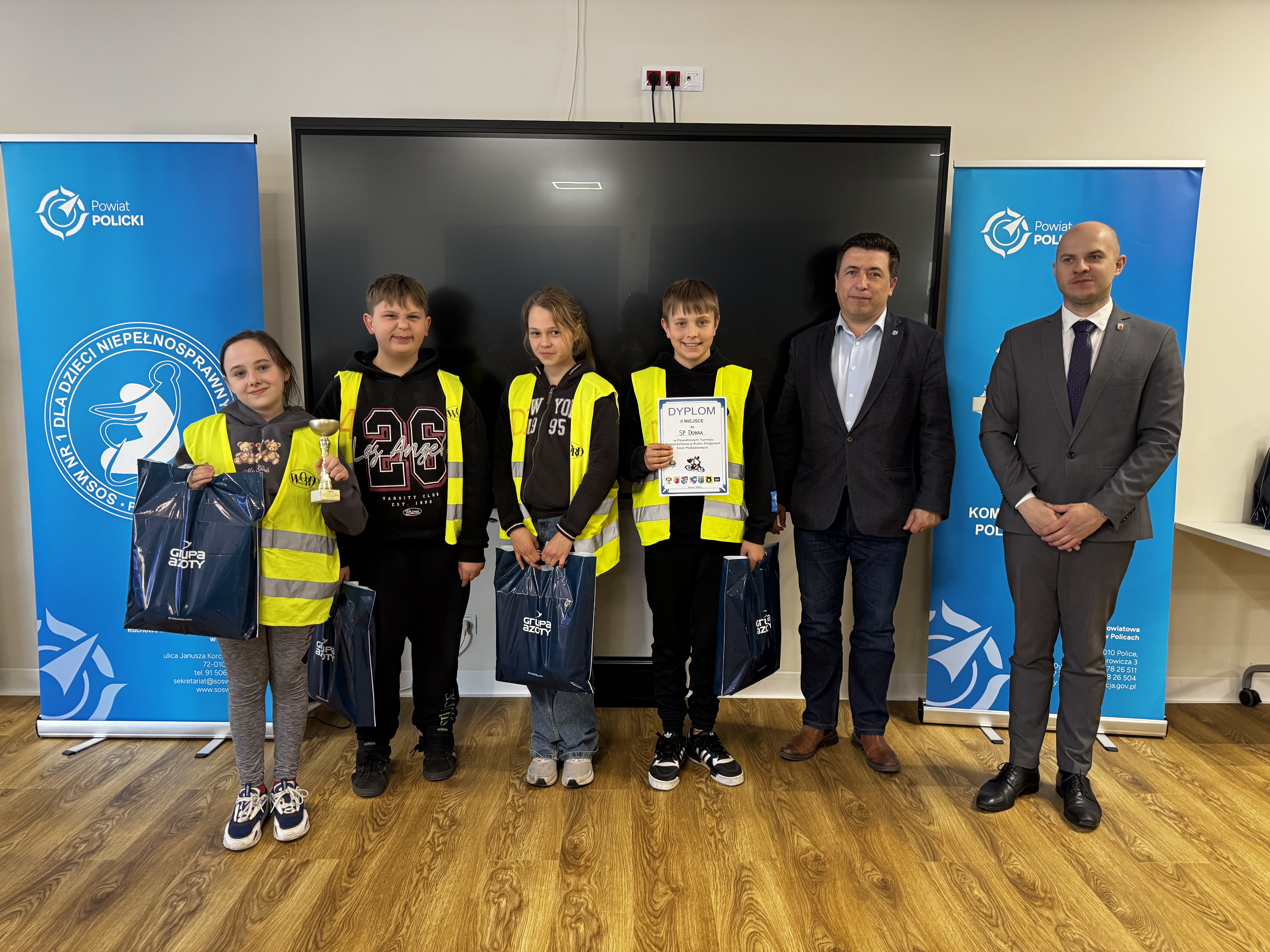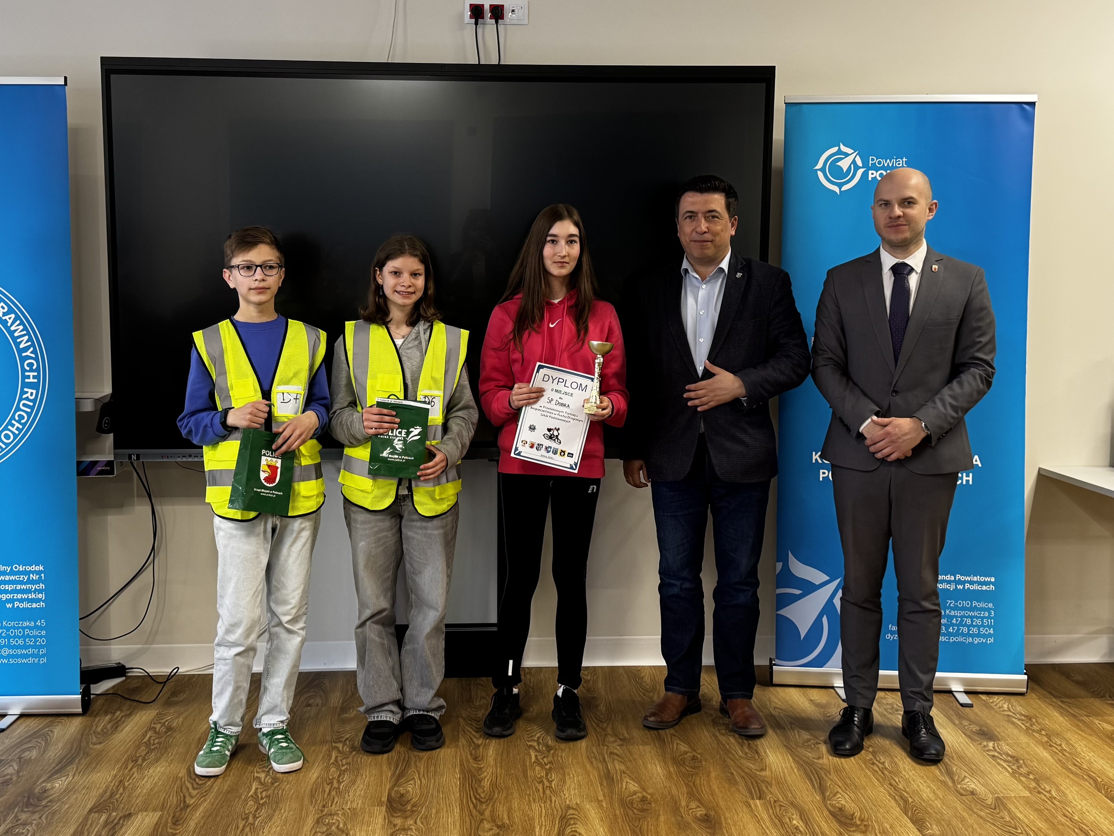 Nagrody dla najlepszych uczestników wręczyli: kom. Marcin Hołoweńko - Zastępca Komendanta Komendy Powiatowej Policji w Policach, asp. sztab. Rafał Idziński - Naczelnik Wydziału Ruchu Drogowego KPP w Policach, Paweł Malinowski - Zastępca Wójta Gminy Dobra, Damian Walczak - Wicestarosta Policki oraz przedstawiciele Gminy Police: Jacek Fabisiak i Radosław Mikołajczyk. W wydarzeniu uczestniczyła również v-ce Przewodnicząca Rady Gminy Dobra - Justyna Suska-Sas.