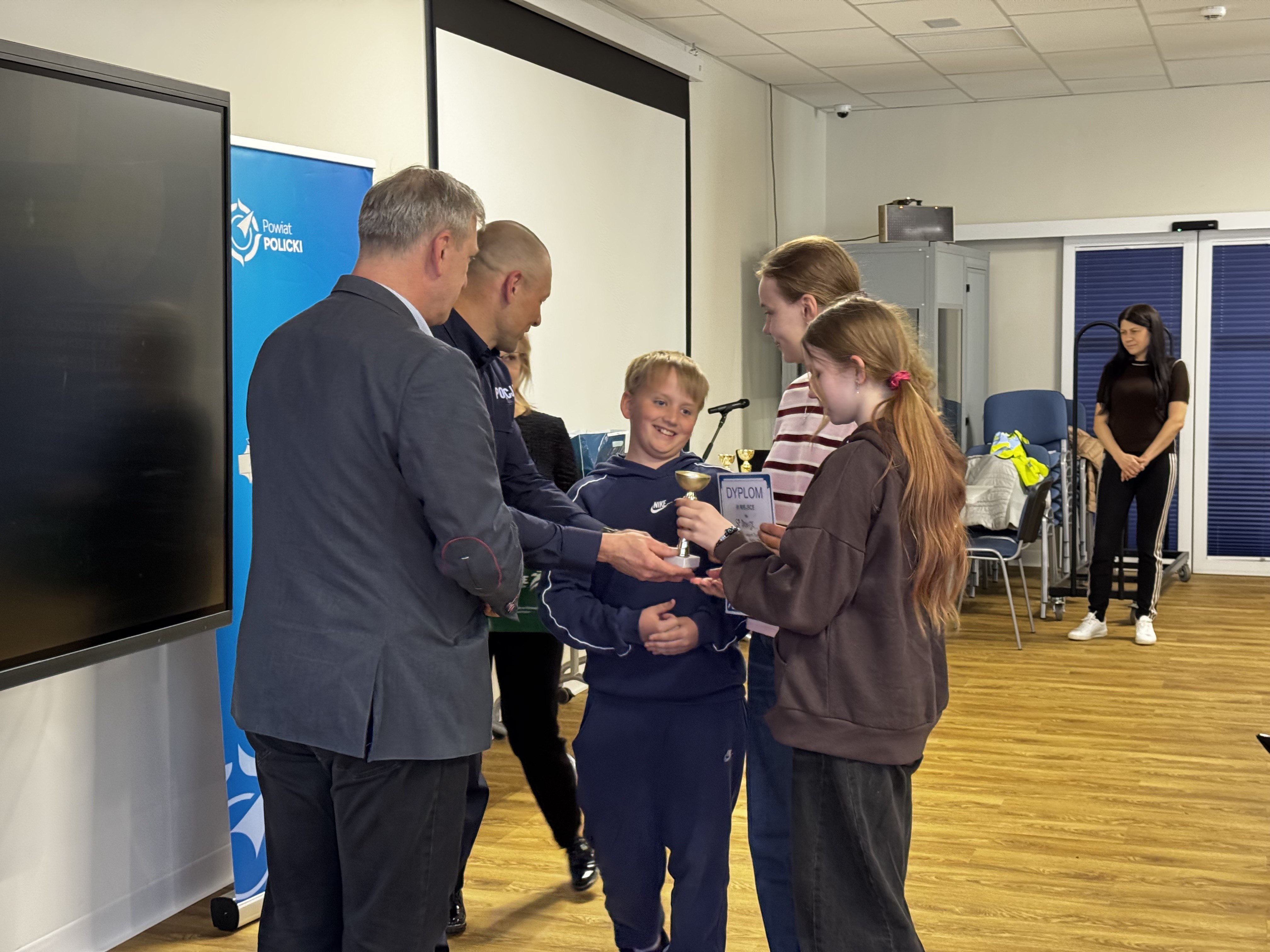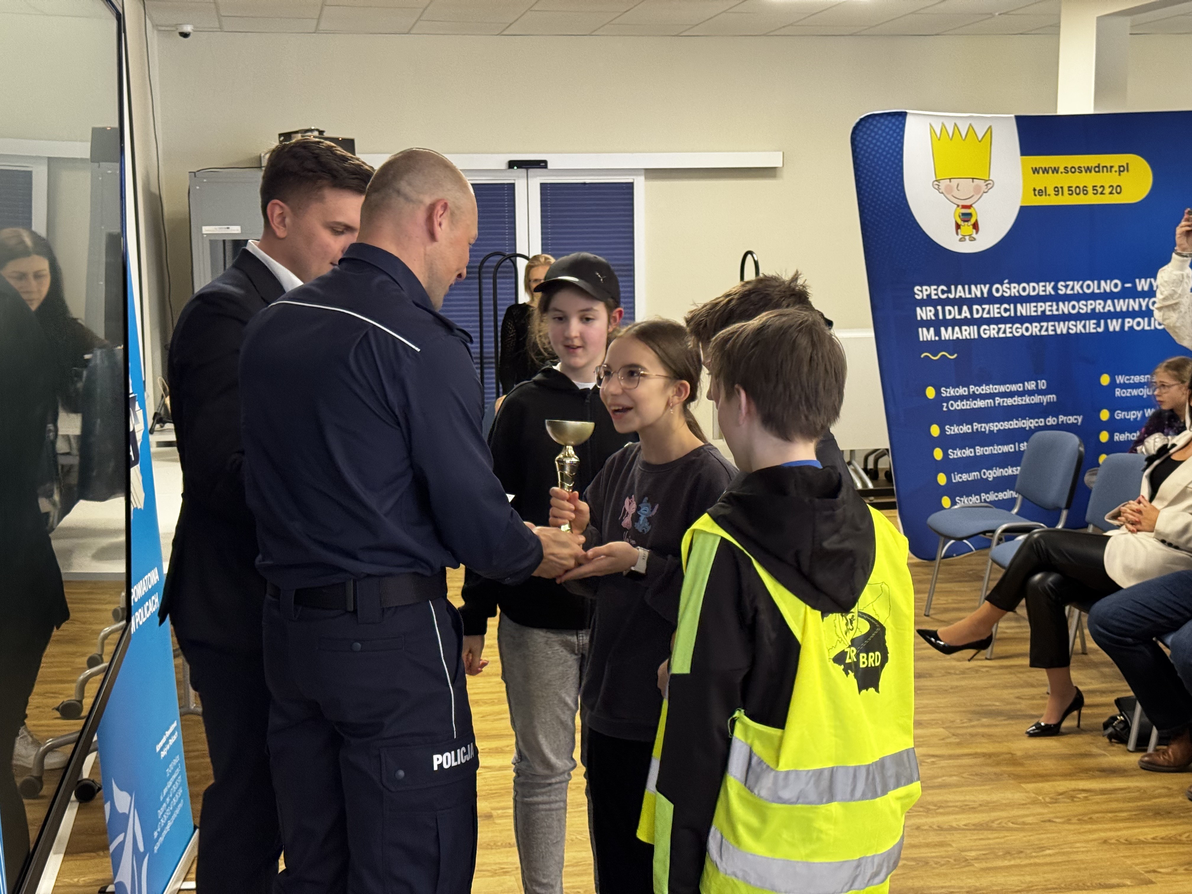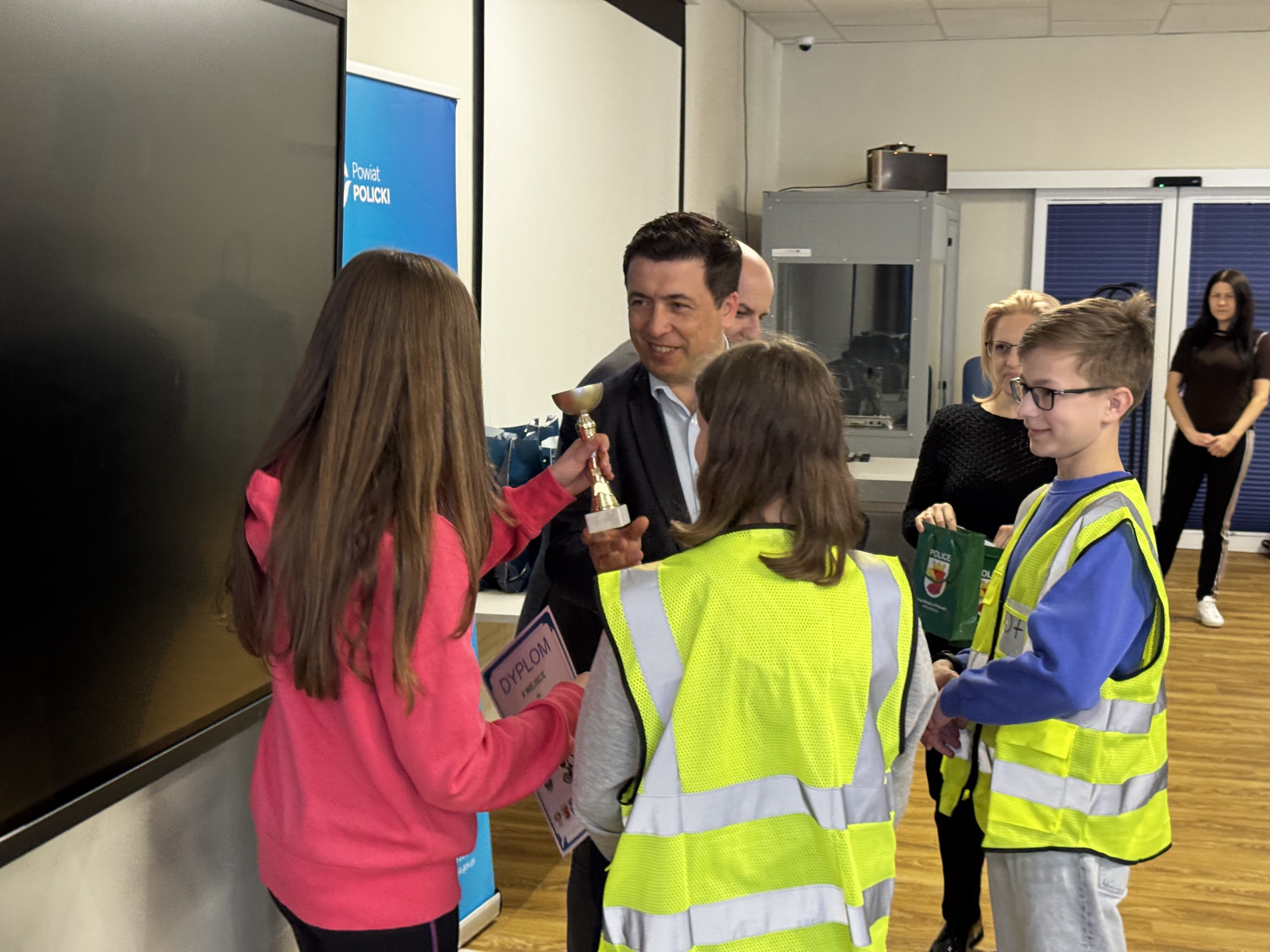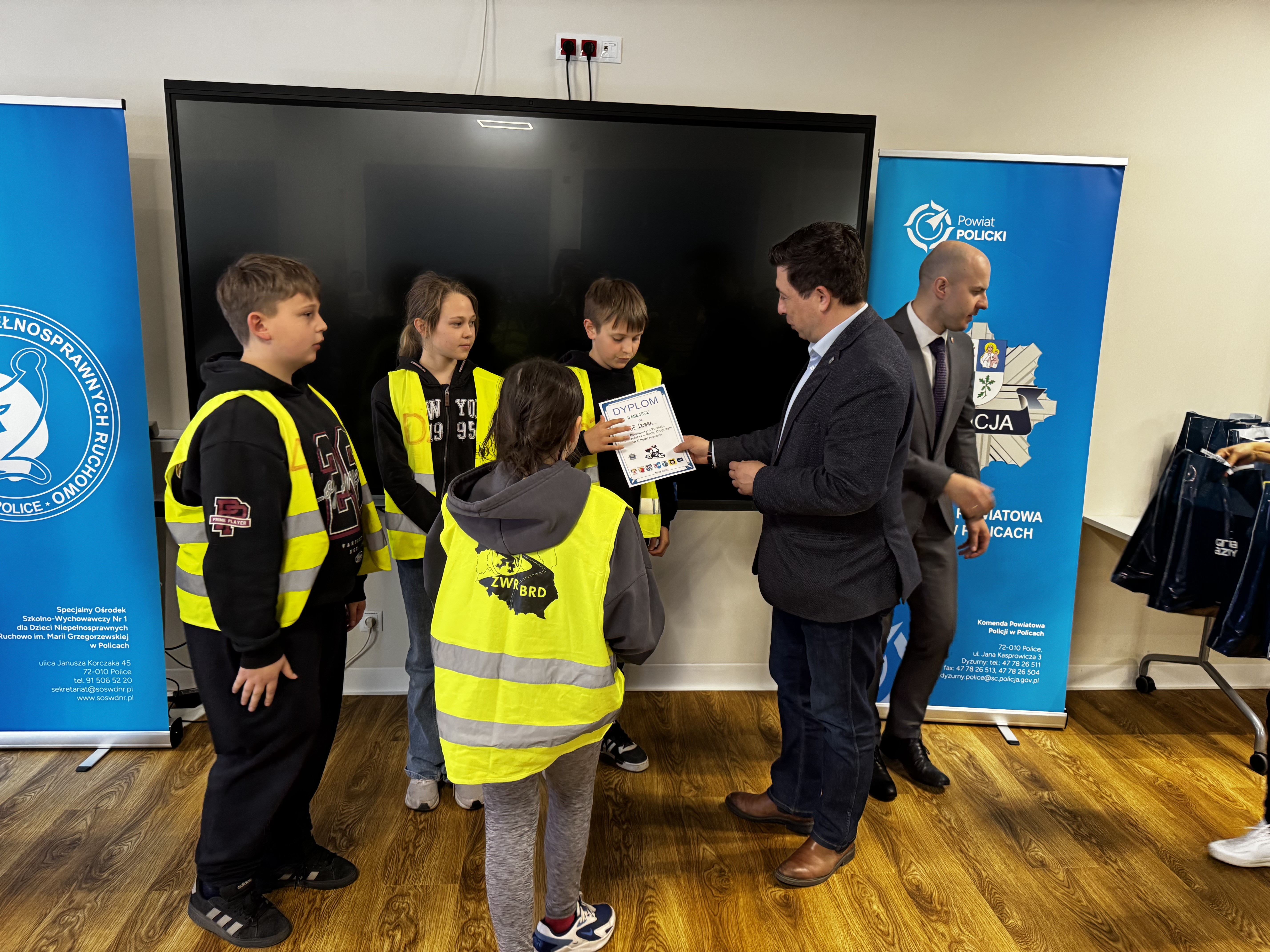 Nagrody dla najlepszych uczestników wręczyli: kom. Marcin Hołoweńko - Zastępca Komendanta Komendy Powiatowej Policji w Policach, asp. sztab. Rafał Idziński - Naczelnik Wydziału Ruchu Drogowego KPP w Policach, Paweł Malinowski - Zastępca Wójta Gminy Dobra, Damian Walczak - Wicestarosta Policki oraz przedstawiciele Gminy Police: Jacek Fabisiak i Radosław Mikołajczyk. W wydarzeniu uczestniczyła również v-ce Przewodnicząca Rady Gminy Dobra - Justyna Suska-Sas.